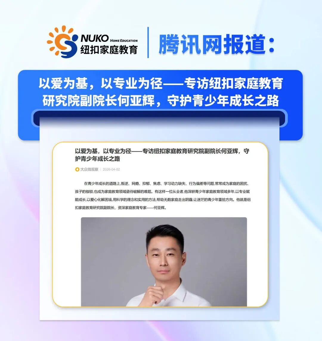 近日,腾讯网上发布了一篇题为《以爱为基,以专业为径——专访纽扣家庭教育研究院副院长何亚辉,守护青少年成长之路》的文章,对纽扣家庭教育进行了深度报道。
